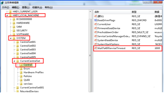 2、进入注册表,定位到:HKEY_LOCAL_MACHINE/SYSTEM/CurrentControlSet/Control。然后找到waitToKillServiceTimeout。