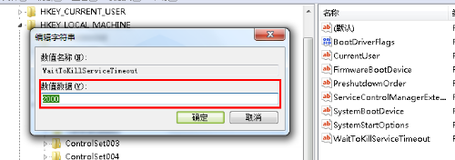 3、点击 “control”这个文件夹,弹出编辑字符串waitToKillServiceTimeout,如果数值是12000,建议改成2000.这样关机的时间就缩短了!点击“确定”即可。