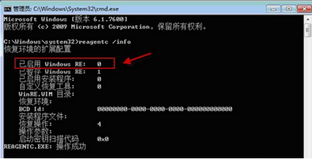 2、在打开的命令提示符窗口中输入“reagentc /info”命令后按回车,之后就会出现windows RE的相关信息,如下图所示“已启用 Windows RE”的值为“0”,则意味着Windows RE 为禁用状态。