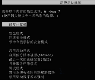 4、设置完成之后,重新启动windows7系统,在启动的时候按下F8键,就可在高级启动选项界面中看到“修复计算机”的选项了。