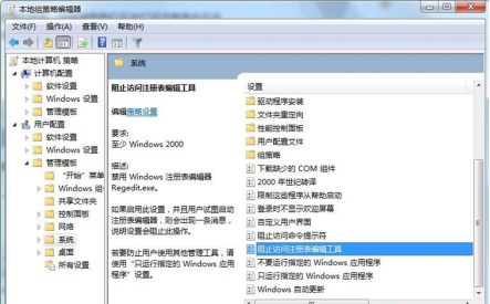 2、在打开的策略组编辑器中,点击“用户配置”的“管理模板——系统”选项,在右侧窗口中找到并双击“阻止访问注册表编辑工具”。