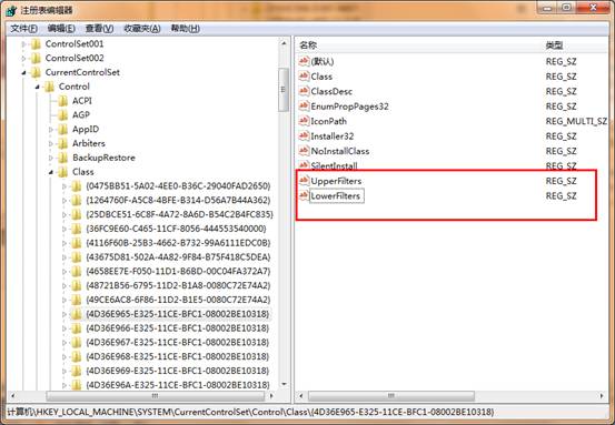 三. 在右边窗口里找到并删除“UpperFilters和LowerFilters”;(如图):