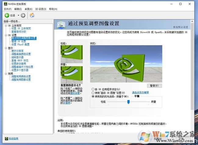 调整显卡的3D设置也是日常中一个立竿见影的方法,N卡A卡都适合。右击桌面空白部位,选择“Nvidia控制面板”(以N卡为例),接下来进入“3D设置→通过预览调整图像设置”标签,选择“使用我的优先选择,侧重于”。接下来根据实际情况将滑杆调至“平衡”或“性能”,反复进入游戏测试即可。