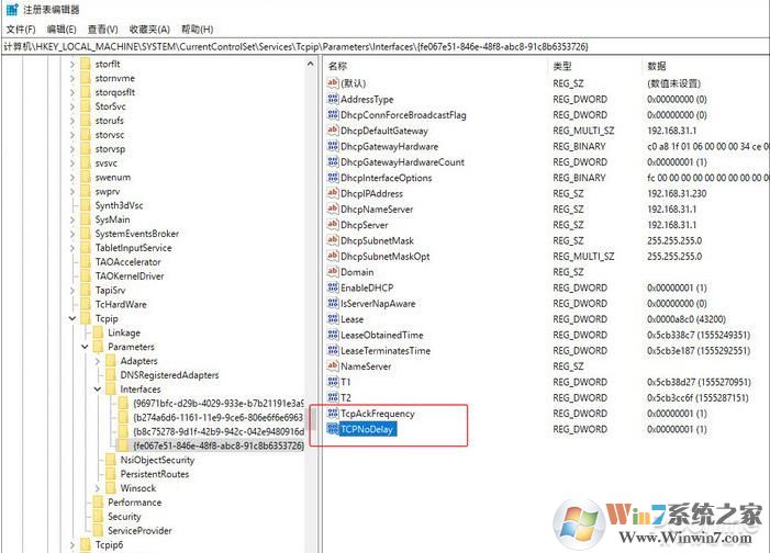 依次点击这些文件夹,找到包含有“DhcpIPAddress”的文件夹,右击并建立两个DWORD(32)值,分别命名为“TcpAckFrequency”和“TCPNoDelay”,键值统一设为“1”。重新启动电脑,Nagle禁用完成!winwin7.com