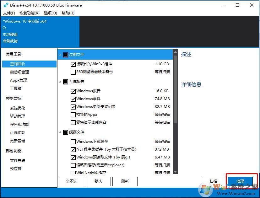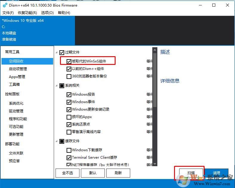 2、打开dism++后,选择空间回收,然后勾选 “被取代的WinSXS文件”选项,点击扫描;(别的清理选项自己酌情选择);