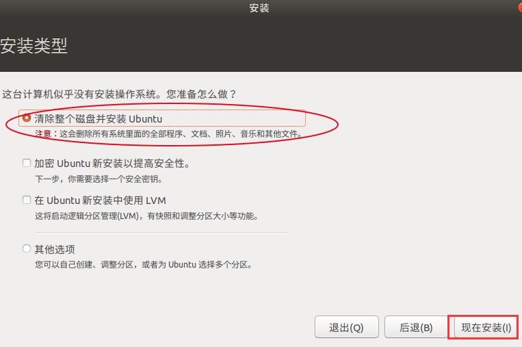 8、在安装类型中,我们选择【清除整个磁盘并安装Ubuntu】,然后选择【现在安装】。再弹出的提示中,选择【继续】就行了、