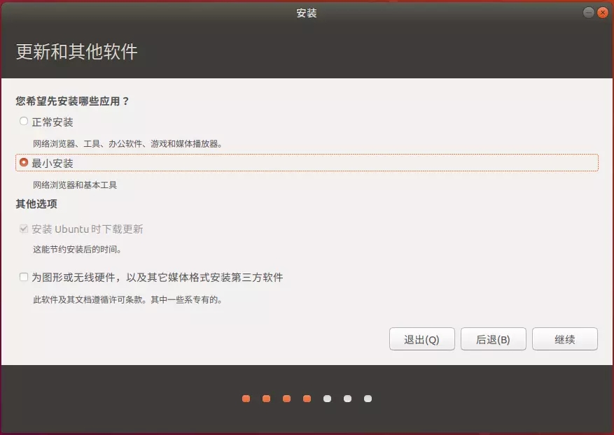 7、在更新和其他软件界面中,我们可以选择【最小安装】,然后点击【继续】。