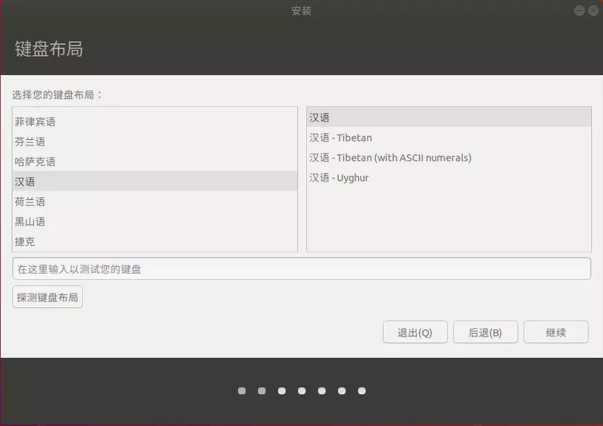 5、键盘布局,已经自动选择完毕了,就是【汉语】就行了,然后点击【继续】。