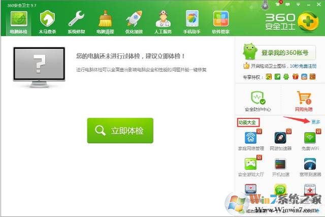 1、打开360安全卫士,在功能大全右侧点击“更多”,就可以看到LSP修复功能;