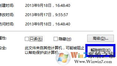 4、随后即可看见解除锁定变为灰色,再点击“确定”按钮关闭文件属性窗口,;