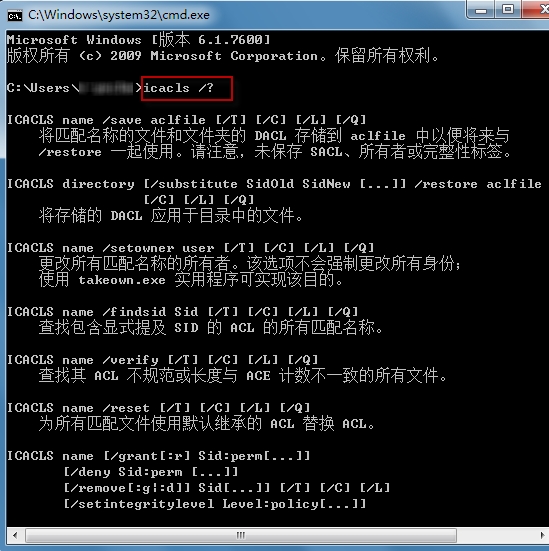 有关 icacls 命令的更多用法和信息,请在命令行中使用icacls /? 查看。