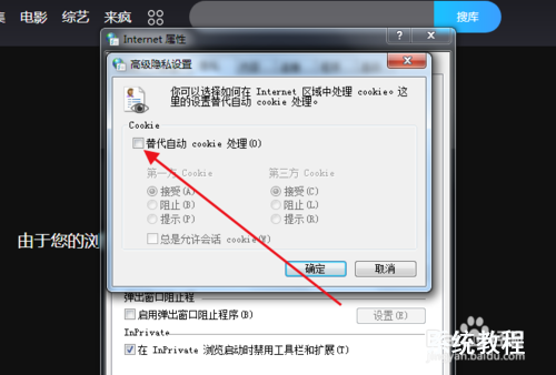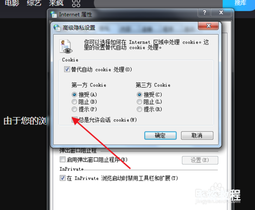 3:点开高级按钮,把替代自动cookie(o)勾,第一方cookie打勾 我接受(A)打勾,第三方cookie打勾我接受(C)打勾,总是允许会话cookie(w)打勾。