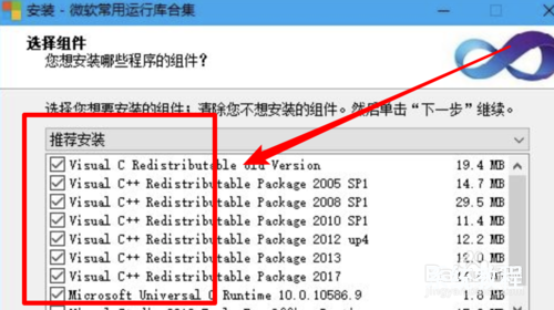 3:下载到后,在安装时,我们可以把里面的所有运行库都勾选安装上。