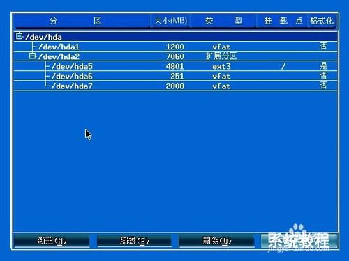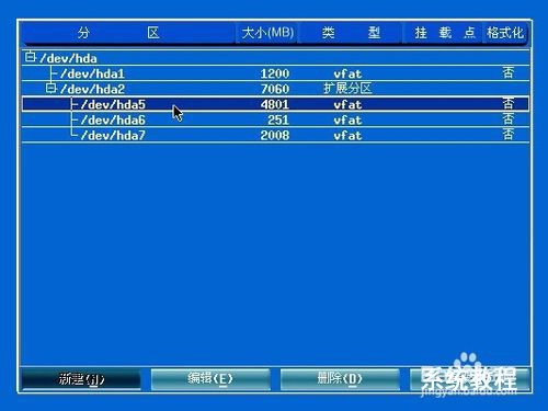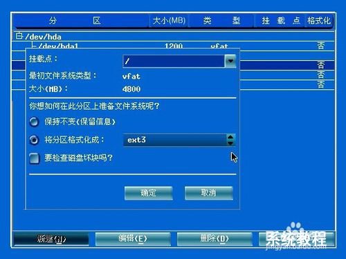 5:挂载点”一栏选择“/”,即使用选定分区的根目录,最初文件系统类型为vfat(即现时的文件系统是FAT32)这种格式是Windows系统专用的,Linux的挂载点只能使用ext2或ext3,所以必需改变文件系统格式,选中“将分区格式化成∶”并在其右侧的选择条中选“ext3”