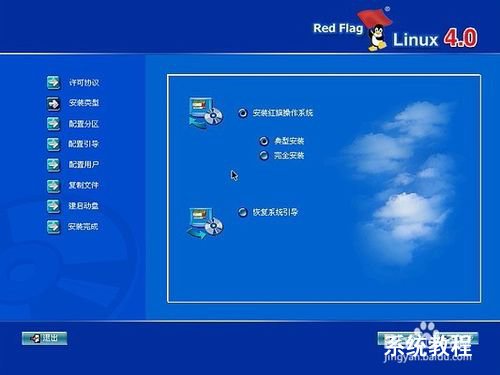 2:选择安装类型,一般选“典型安装”即可,这里还有一个选择:“恢复系统引导”,它的作用是在以后系统使用中,系统引导出问题时用它进行恢复的.这里先不管它,点下一步