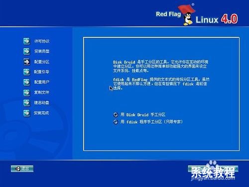 3:配置分区是关键的一步,搞不好会丢失硬盘有用数据,请小心,有些长期使用Windows的人装不了Linux的主要原因也是因为这一步不懂。如果选“用fdisk程序手工分区”后,点击“下一步”