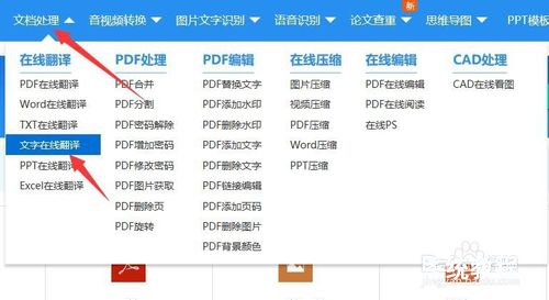 2:在工具首页的导航栏 “文档处理”的下拉框内选择“文字在线翻译”功能选项进入待转换操作的页面。