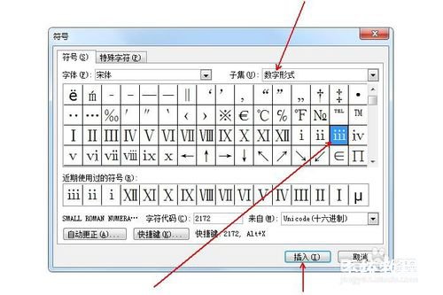 4:在“子集”中选择“数字形式”,并在下方选中小写罗马数字3(ⅲ),点击“插入”。