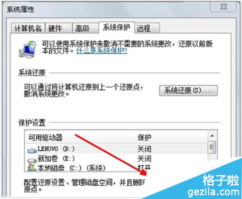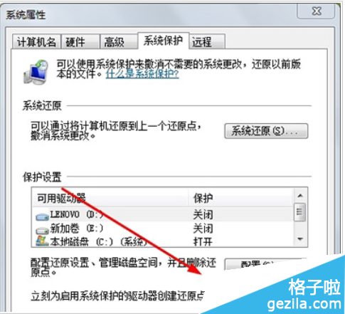 3:在“系统属性”对话框中选中需要开启还原点设置的驱动器,单击“配置”按钮。