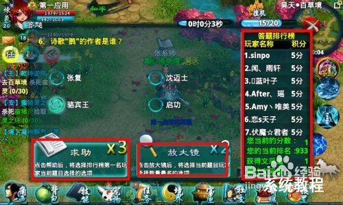 5:等待时间过了后,进入答题活动界面,每个题目都有4个选择选项,在答题界面的下面有求助X3和放大镜X2那是求助的功能,选择“放大镜”即可自动选择正确的答案,选择“求助”即可把答题排行榜几份第一名的答案,自动选择为自己的答题答案(如图上所示)
