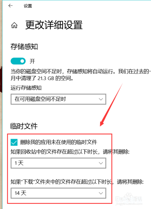 7:除此之外,我们还能在”更改详细设置“中,选择定时删除临时文件以及”下载“文件夹中的文件。