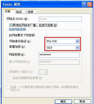 4、最后将弹出的“Tenda”属性菜单核对网络验证、数据加密、网络密钥设置和无线路由器一不一样,如图: