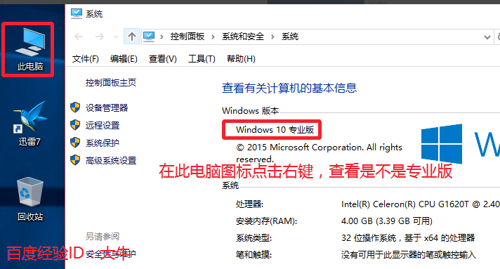 2、其它版本win10系统,小编没有测试,在Windows10专业版测试成功,我们可以在此电脑图标上点击右键,打开属性,查看自己win10系统版本。