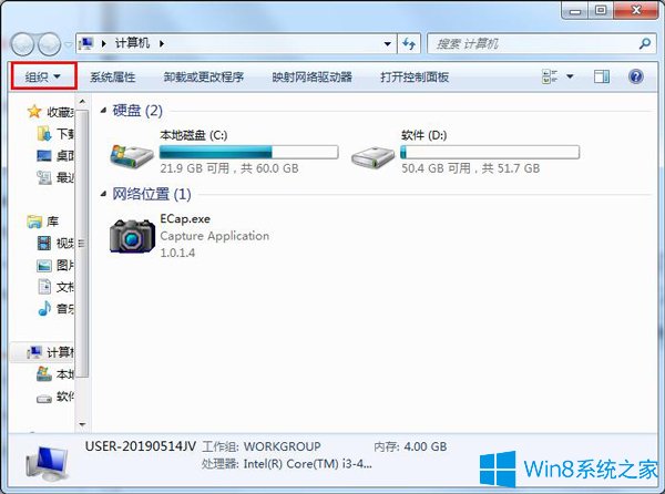 1、展开计算机右上角的【组织】菜单;