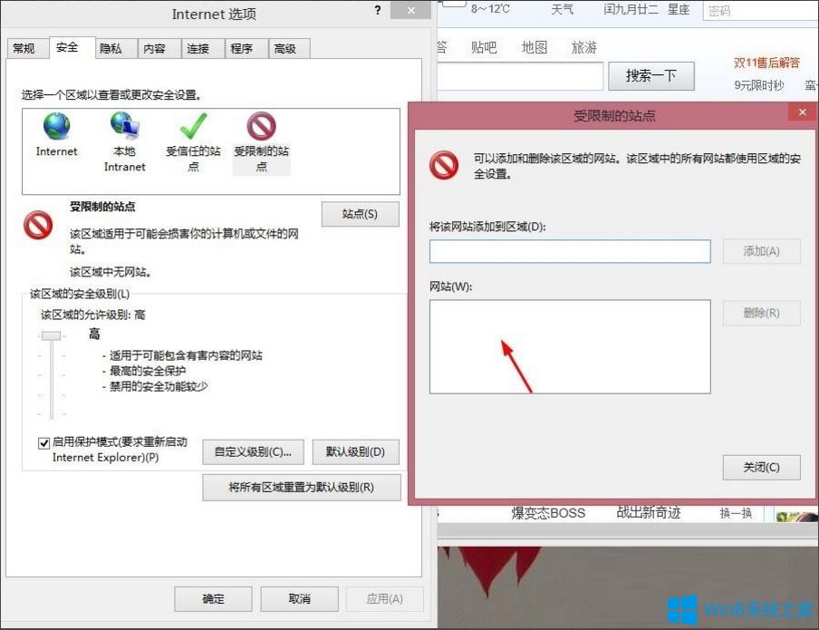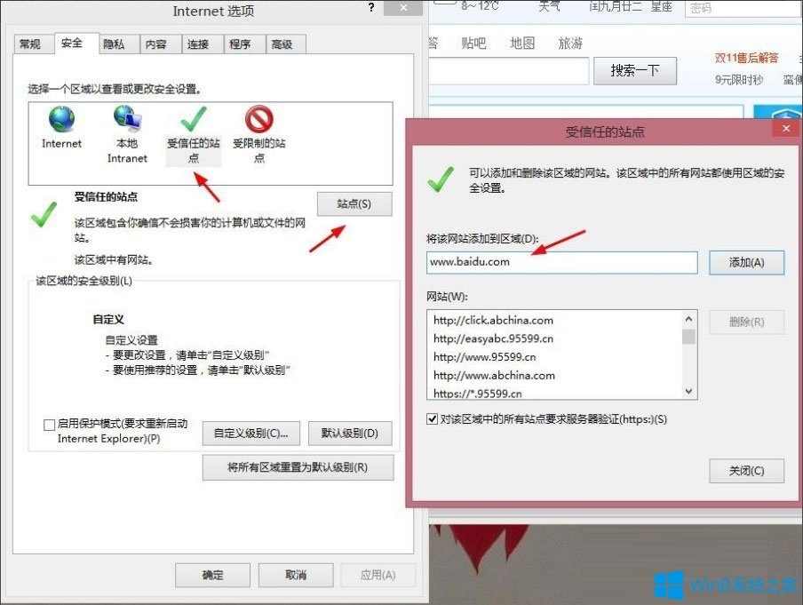 5、看看受信任站点里面有没有把要用的网站加入到下面,如果加入到下面就把他删除;