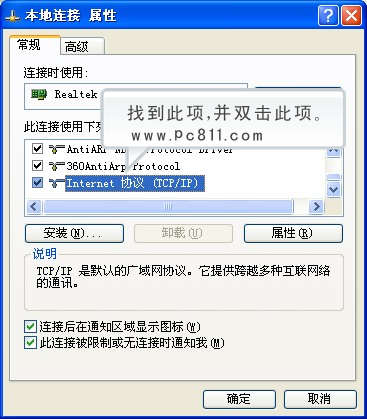 第4步:在打开的本地连接属性窗口中找到“tcp/ip”此项,并双击此项。