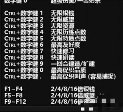 需要注意的是“无限银钱”在银钱改变时生效;“无限威望”在威望改变时生效;“无限资源”在某种资源数量改变时对那种资源生效,数值变为能携带的最大值。“无限银钱”和“无限威望”在生效时会获得1000万银钱/威望,生效后会自动取消激活,有需要可以重复激活。“无敌模式”激活时,玩家受到的绝大多数伤害都变为0或者接近0的数值。