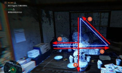 2、在垃圾屋前消灭被大洞引来的异访者,在房间中对准不停变化的茶几按照下图所示顺序和方向结印使恶灵显形