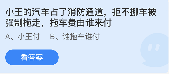 2、小王的汽车占了消防通道拒不挪车被强制拖走拖车费由谁来付?
