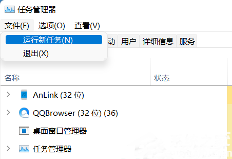 2、打开“任务管理器”后点击“文件”--》“运行新任务”;