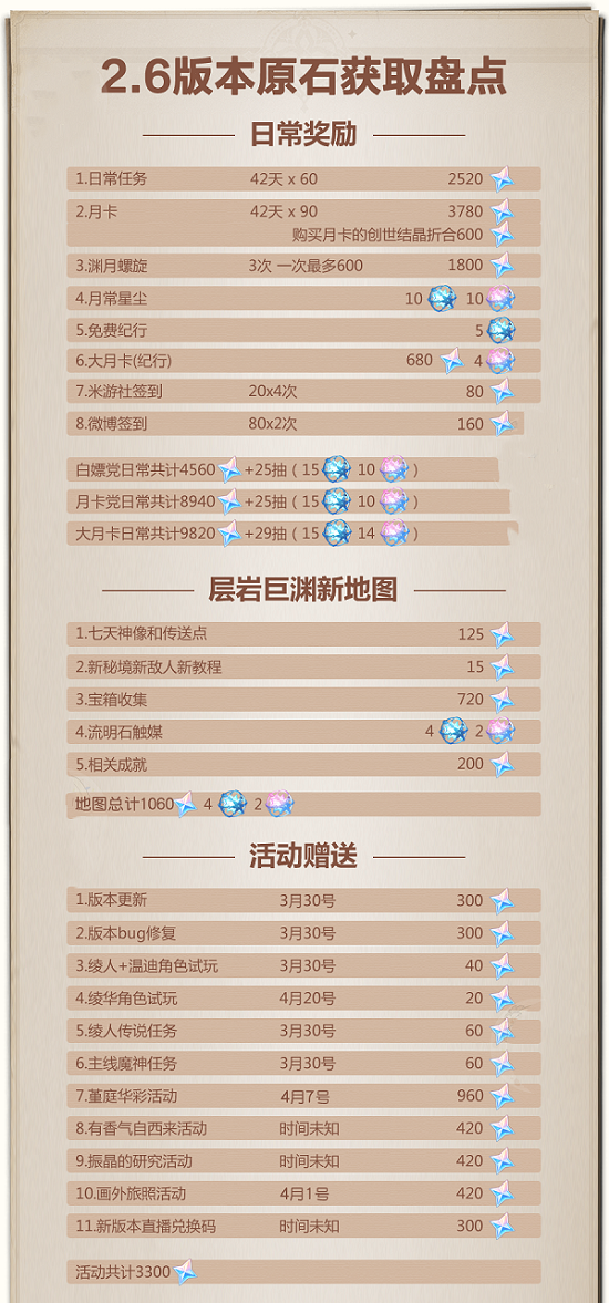 2.6版本维护补偿、2.6版本bug修复、21天日常奖励、三次米游社签到 一次微博签到、绫人角色试玩、温迪角色试玩、绫人传说任务、魔神主线任务、两期深境螺旋、4月月常兑换、21天月卡奖励(月卡党)、纪行前半段(大月卡党)、一次月卡购买(月卡党)、层岩巨渊地图、堇庭华彩活动、画外活动