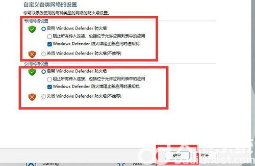 5、然后在专用和共用网络设置中,分别勾选最下方的“关闭windows defender防火墙”,再确定保存即可。