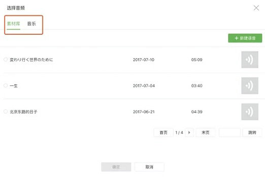 5、然后在自己的素材库中选中想要的音乐,选完之后点击“确定”就可以插入到文章中了。