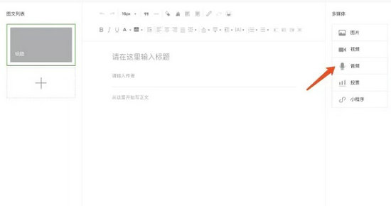 4、接着我们进入公众号文章编辑处,点击右侧多媒体下的“音频”