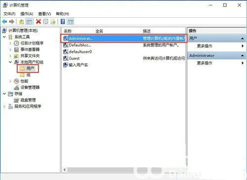 3、接着在计算机管理窗口中,依次展开:本地用户和组 - 用户,然后在用户右侧界面找到“Administrator”帐户。
