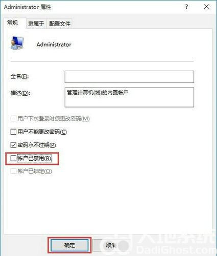 4、双击打开Administrator帐户,然后在弹出的Administrator属性窗口中,点击取消勾选“帐户已禁用(B)”点击确定完成操作。
