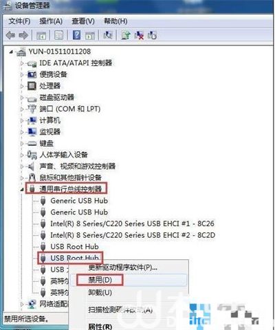 2、接着在设备管理器窗口中点击通用串行总线控制器,然后右键点击usb root hub选项,先设置成禁用,再设置成启用。如图所示: