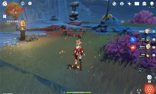 第二件供物,岁时之冕。这件供物因为在地面,也是可以在跑图的过程中完成的,位于地面矿区右边的传送点附近。参照物是几块大型的岩元素共鸣镇石,如果实在找不到位置,就记住在传送点的左上方一段距离就行。供奉物就放在上图中的桌子上面,并且由一个盗宝团成员看守着,我们击败盗宝团成员之后,就可以调查桌子拿到岁时之冕。