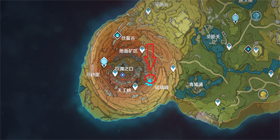 第六件供物,同泽之枪。这件供物就在接取任务的地点附近,打开大地图我们可以看到“天工峡”三个字的地名标注,地名的正上方最高处的山崖上,就是同泽之枪的位置了。这个地方很容易攀爬,基本上没有什么难度,我们可以从巨渊之口的传送点出发,也可以从天工峡的传送点出发,就看你自己觉得哪里近了,路上的共鸣岩记得解下谜,有宝箱拿。