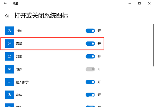 3. 接着,在弹出的“打开或关闭系统图标”窗口中,找到并点击开启“音量”。