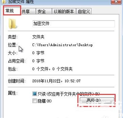 1.右键需要加密的文件夹,打开属性窗口后选择常规中的高级进入。