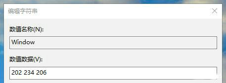 3、编辑字符串窗口中,修改数值数据为 202 234 206,默认 255 255 255(后期需要改回默认,需要输入默认值);