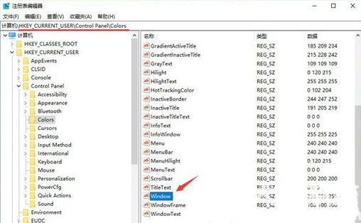 2、注册表编辑器窗口中,依次展开到:HKEY_CURRENT_USER\ControlPanel\Colors ,然后找到并双击打开 Window;