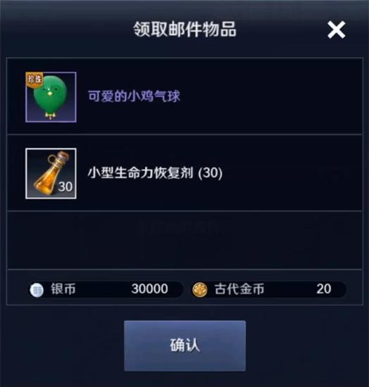兑换内容:可爱的小鸡气球*1,古代金币*20,银币*30000,小型生命力恢复剂*30