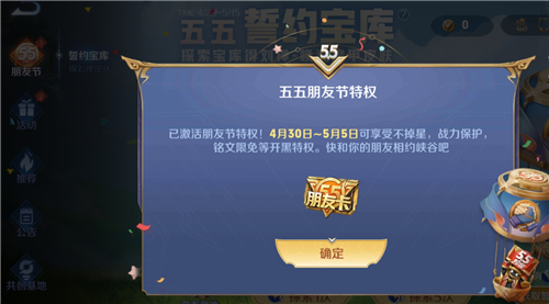 2.使用方式,就是在4月30-5月5日期间去打排位赛,第一把排位失败不掉英雄战力。并且前两把排位赛输了,不会掉星,如果排位赛赢了还能额外加一颗星。这些特权,每天只能激活一次。