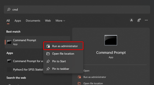 点击Windows键,输入cmd,然后右键单击第一个结果,然后选择Run as administrator。